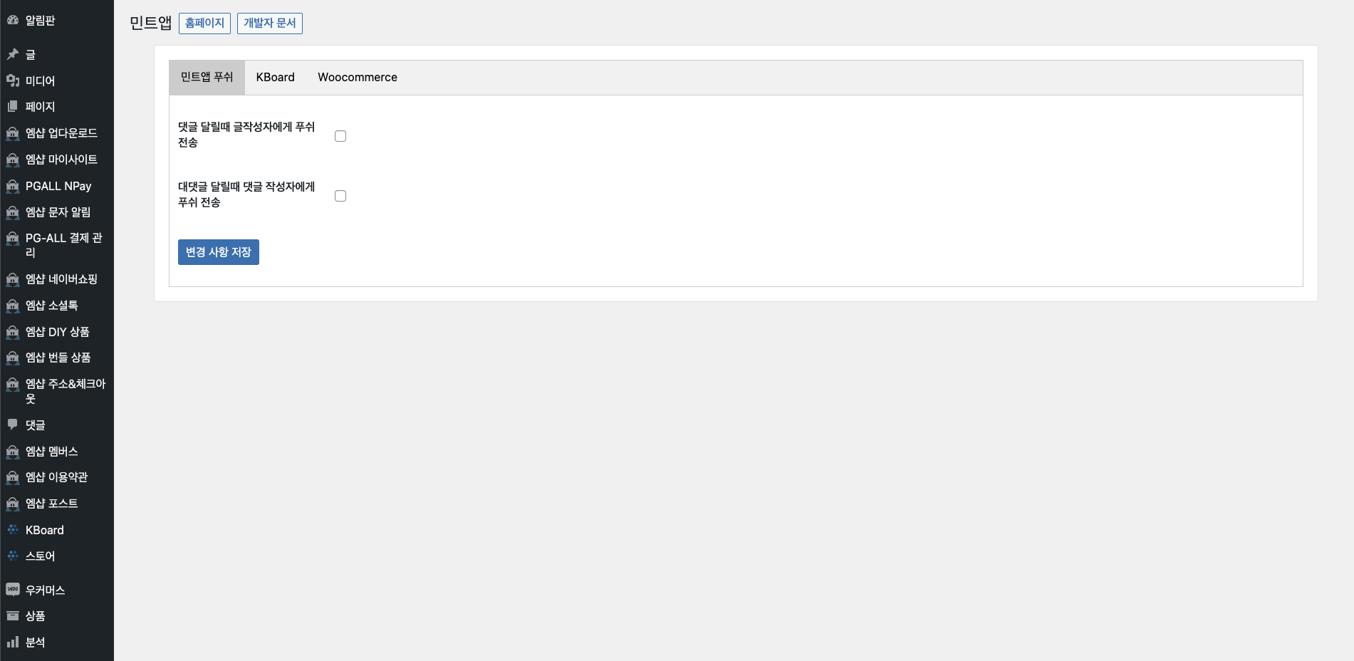 또한 kboard 우커머스가 설치되어있다면 푸쉬 설정창이 나오게 됩니다.