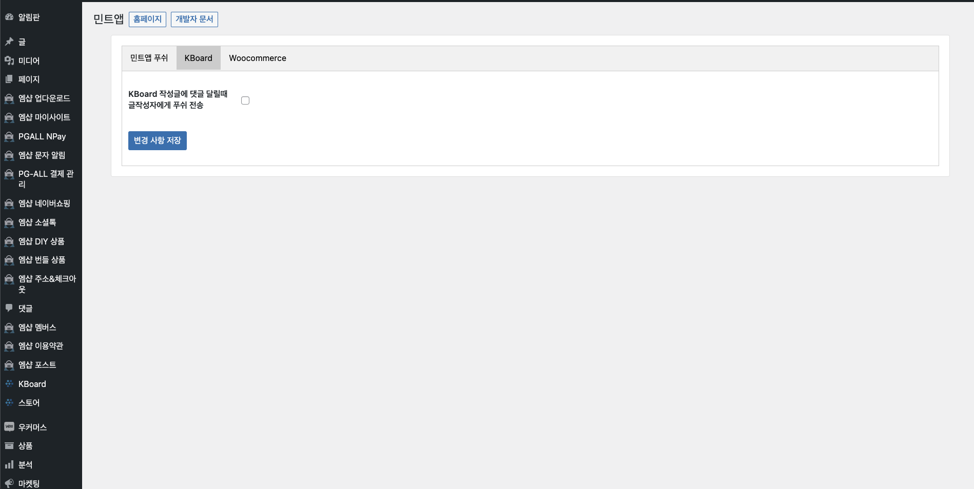 또한 kboard 우커머스가 설치되어있다면 푸쉬 설정창이 나오게 됩니다.