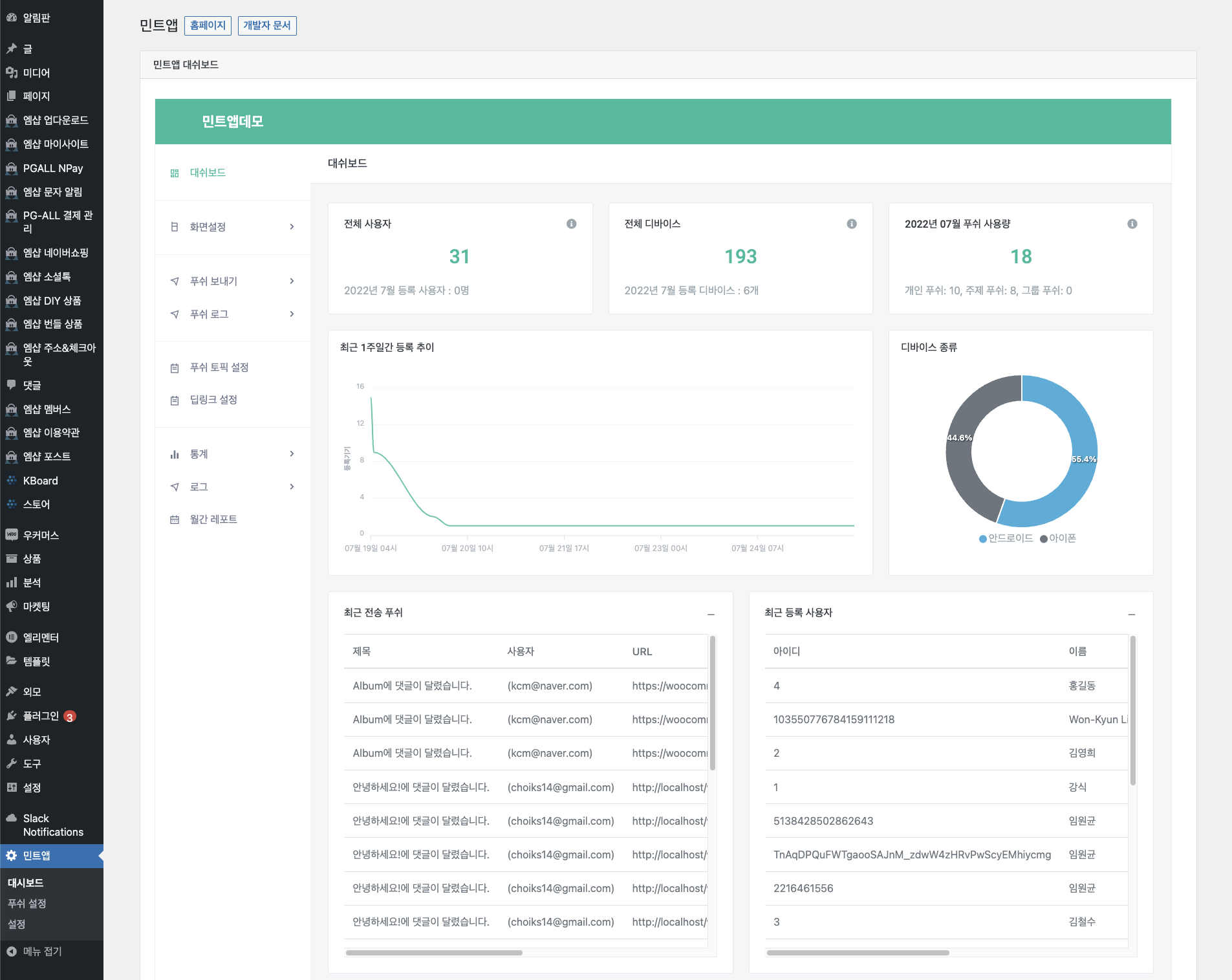 민트앱을 워드프레스 & 우커머스 사용하기 위해서 플러그인을 제공합니다. https://www.mint-app.com 에서 회원가입하시고 워드프레스&우커머스를 요청하시면 파일을 전송하여 드립니다. 설치 방법까지 내장되어있으니 금방 설치 가능합니다. 아래는 민트앱 워드프레스 플러그인 사용법입니다. 1.먼저 민트앱을 플러그인 폴더에 복사합니다. 그리고 패키지내의 설명서에 나와있는 내용대로 플러그인 설치를 조금 수정합니다. 2.민트앱에서 받은 키를 등록합니다. 키값과 비밀키값을 설정하면 민트앱을 사용하기 위한 모든 준비가 완료 되었습니다. 3.푸쉬를 보내기위한 조건을 설정합니다. contents 테이블의 푸쉬를 설정할수 있습니다. 또한 kboard 우커머스가 설치되어있다면 푸쉬 설정창이 나오게 됩니다. 전체 ..